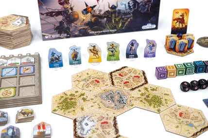 Contents: 1 starting tile, 28 landscape tiles, 6 cardboard Hero standees and 6 plastic stands, 6 Hero cards, 5 Hero boards with inventory, 6 city tokens, 6 Hero dice, 35 unit dice, 5 glory banners, 30 life tokens, 30 building tokens, 40 food tokens, 40 wood tokens, 40 stone tokens, 1 cloth bag, 36 monster army tokens, 1 Dark General standee with special tile, 5 Praetorian tokens, 1 plague token