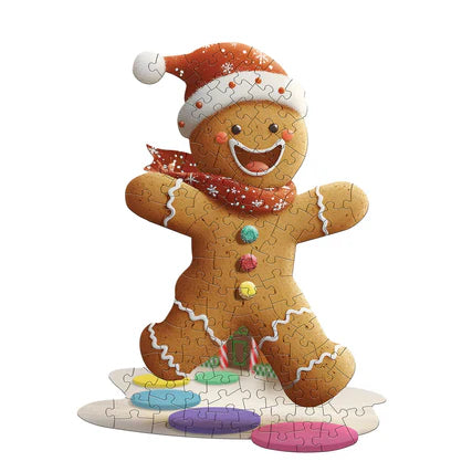 One Smart Cookie! Unique, gingerbread man-shaped 100-piece jigsaw puzzle for ages 5 and up. Poster-sized when completed. Puzzle pieces are oversized for easy handling.