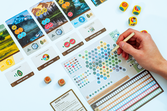 Cascadia: Rolling is a series of puzzly flip-and-roll-and-write games featuring the habitats and wildlife of the Pacific Northwest! Simultaneously roll dice, collect wildlife, and complete habitat cards to fill in different environments in Cascadia.