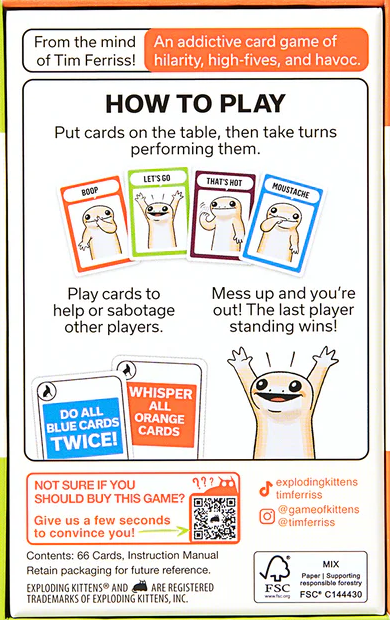 From the mind of Tim Ferriss comes a mental obstacle course where you’ll have to think fast, act faster, and stay on the beat to win. Put Cards on the table, then take turns performing the Actions on the Cards while banging out a beat on the table. Add new Cards and Modifiers to the row of Cards to sabotage other players. Mess up the beat or the action and you’re out. The last player standing wins!