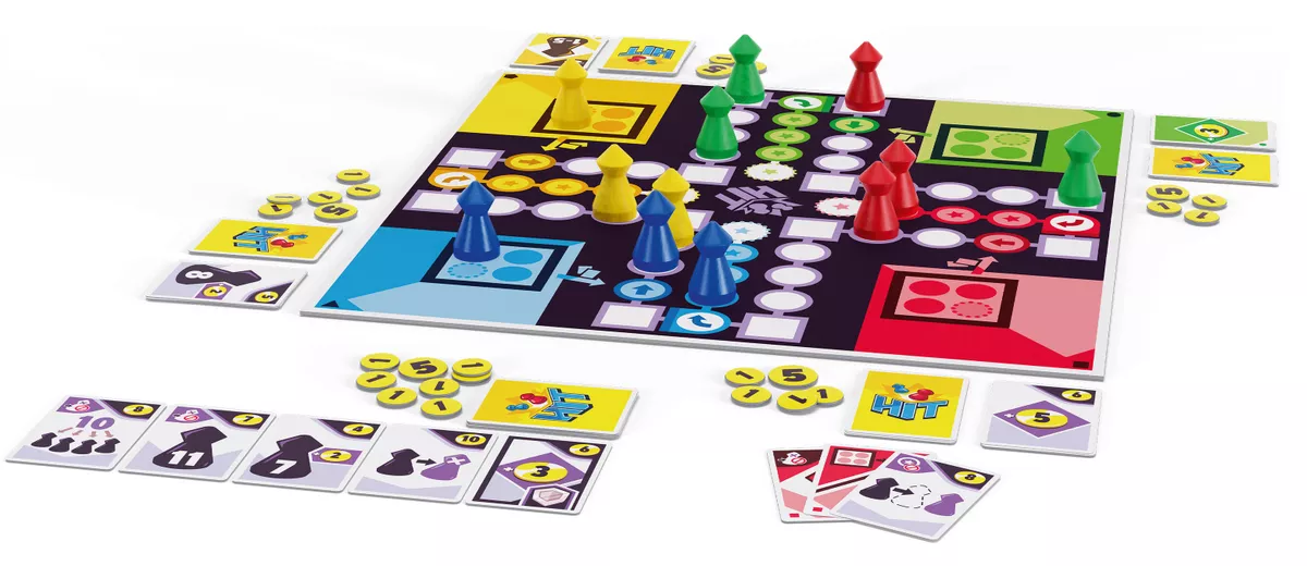 But unlike Pachisi and other similar games, in HIT you use cards to control how your pawns move, with your deck of cards changing over the course of play. Whoever gets their pawns to the finish line first wins.