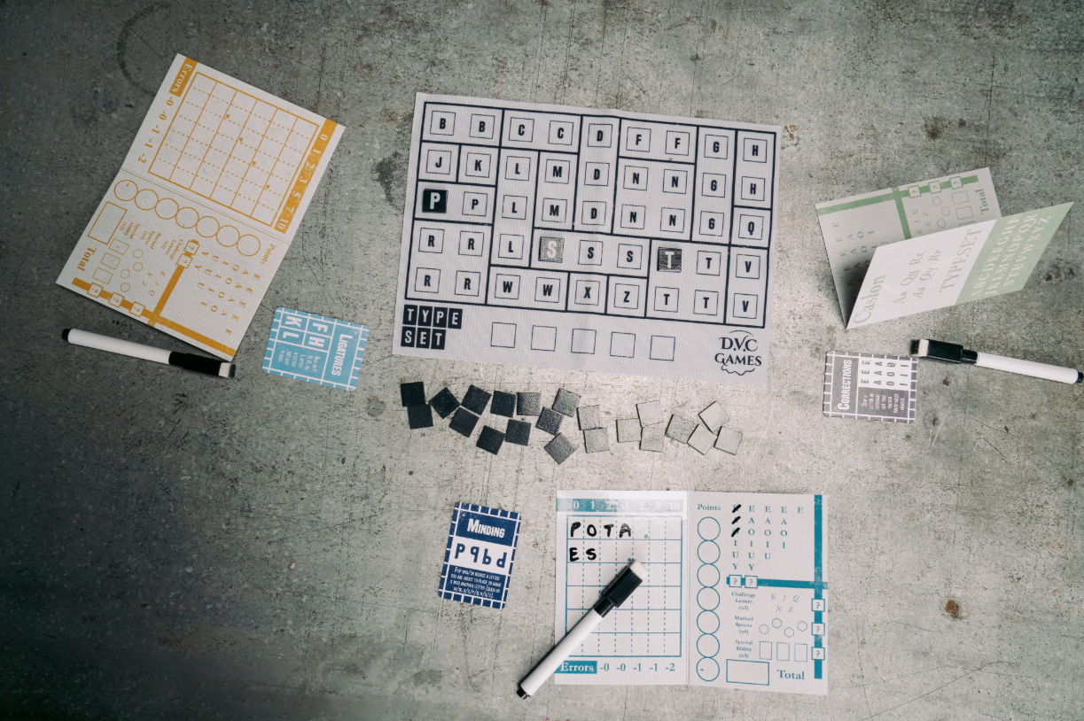 TYPESET is a puzzling word game for 1 - 6 players where you build words and take risks. Score the most points by creating the longest words, but be careful- you must ‘load’ each letter in from left to right, committing early to possible words that may be harder to finish later. Combos allow for some freedom in getting the letters you want, as well as rule-bending special abilities that you can use to your advantage. Play solo or simultaneously, and see who can be the best printmaker.